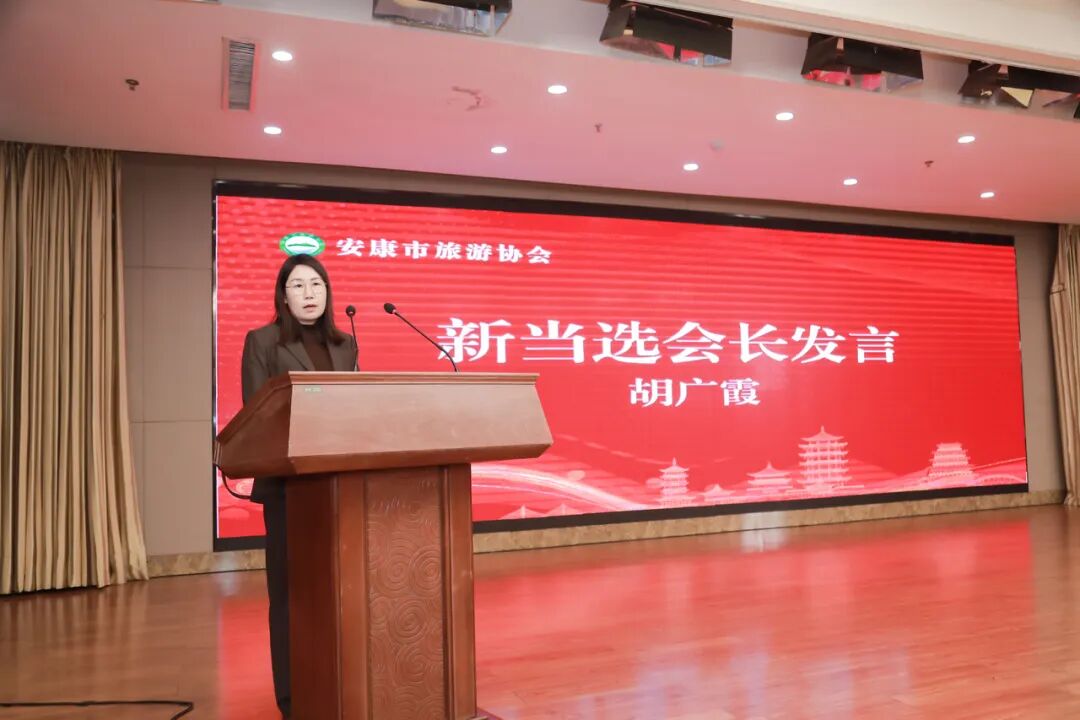 新当选的安康市旅游协会会长胡广霞代表新一届理事会发言。她表示,接过这份沉甸甸的信任与责任,新一届领导班子将恪尽职守,紧紧围绕安康市委、市政府关于文旅产业发展的战略部署,在主管部门的指导下,着力做好以下工作: