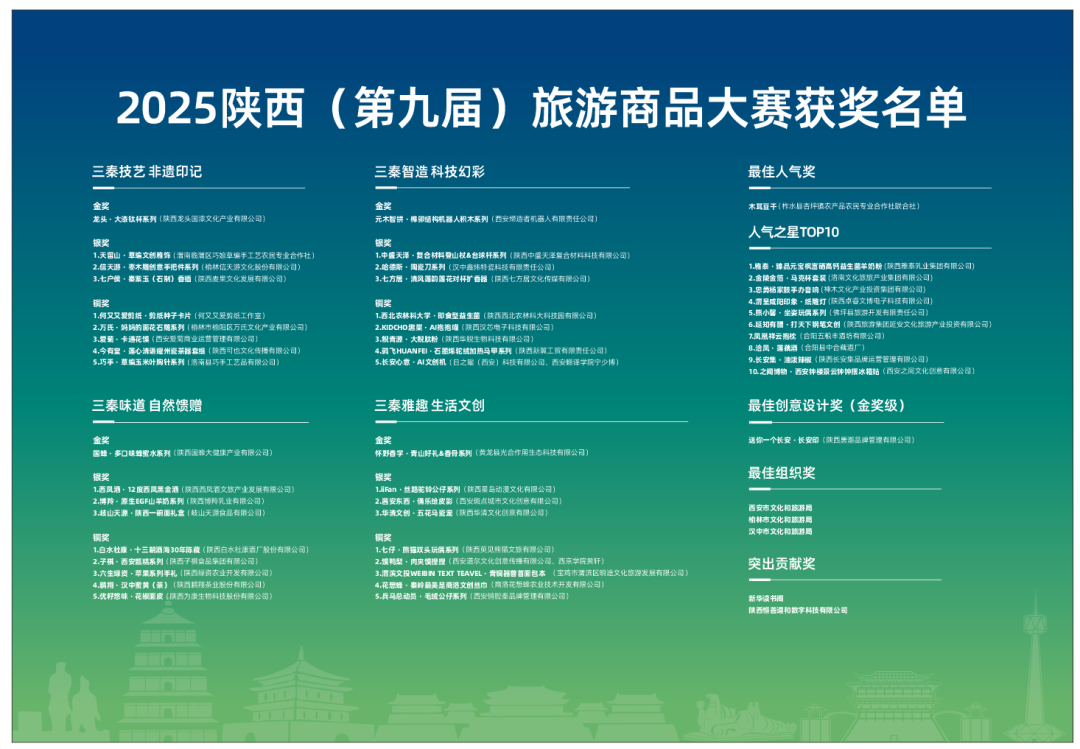 近日,由陕西省文化和旅游厅指导,陕西省旅游协会主办的2025陕西(第九届)旅游商品大赛圆满落幕,评选结果正式公布。本届大赛以“三秦四季·好物好礼”为主题,共征集到全省各地市推荐旅游商品459套2000余件,涵盖非遗技艺、地方美食、生活文创、科技智慧四大类别。历经近一个月的多轮评审与网络人气投票,最终评选出金奖、银奖、铜奖及“最佳创意设计奖”“最佳人气奖”等专项荣誉,集中展示了我省旅游商品创意创新发展的新成果、新趋势。