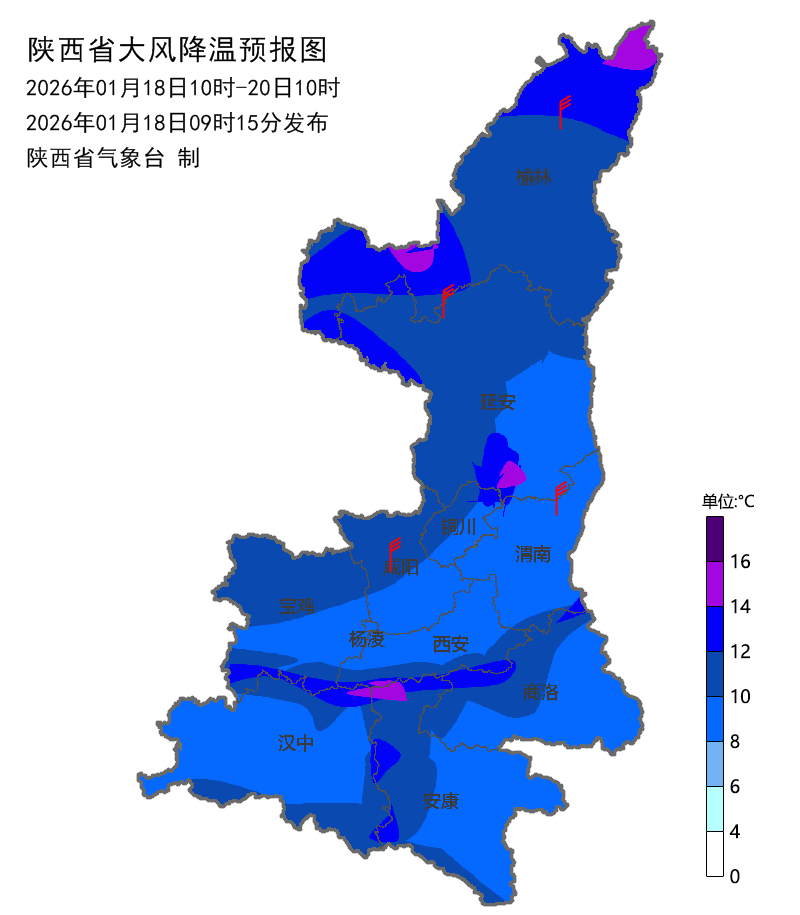 受寒潮影响,预计2026年1月18日10时至1月20日10时,过程降温全省大部下降8~10℃,榆林、延安大部、关中西部局地及北部局地、秦巴山区下降10~12℃,其中榆林北部和西部(神木市、府谷县、靖边县)、延安南部局地(黄陵县、黄龙县、志丹县)、宝鸡西部局地(陇县、凤县)、秦巴山区(长安区、鄠邑区、太白县、蓝田县、周至县、紫阳县、岚皋县、平利县、镇坪县)可达12℃以上(图2)。预计最低气温陕北出现在1月21日清晨、关中、陕南地区出现在22日清晨,最低气温:陕北北部-19~-16℃,陕北南部-15~-11℃,关中北部-10~-8℃,秦岭山区-14~-10℃,关中南部、安康-8~-5℃,商洛-10~-7℃,汉中-8~-3℃。